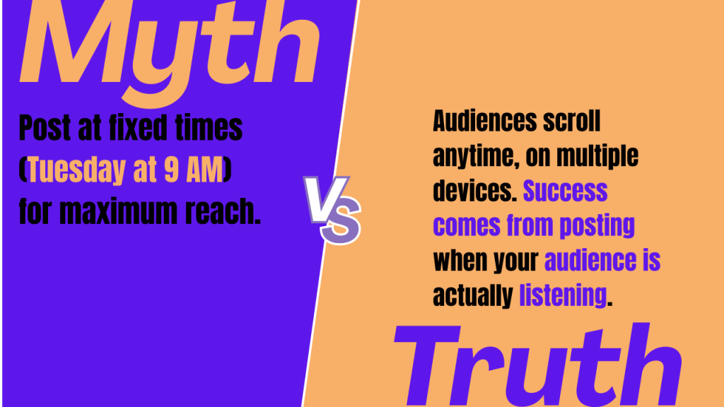 Truth: Audiences scroll anytime, on multiple devices. Success comes from posting when your audience is actually listening.